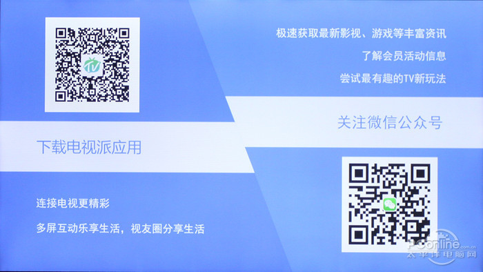 打开多屏互动,会呈现下图两个二维码,另一个是酷开TV微信号,笔者通过扫描下载电视派APP(电视派是一款通过智能终端对大屏显示设备进行内容推送及控务的免费使用法式。