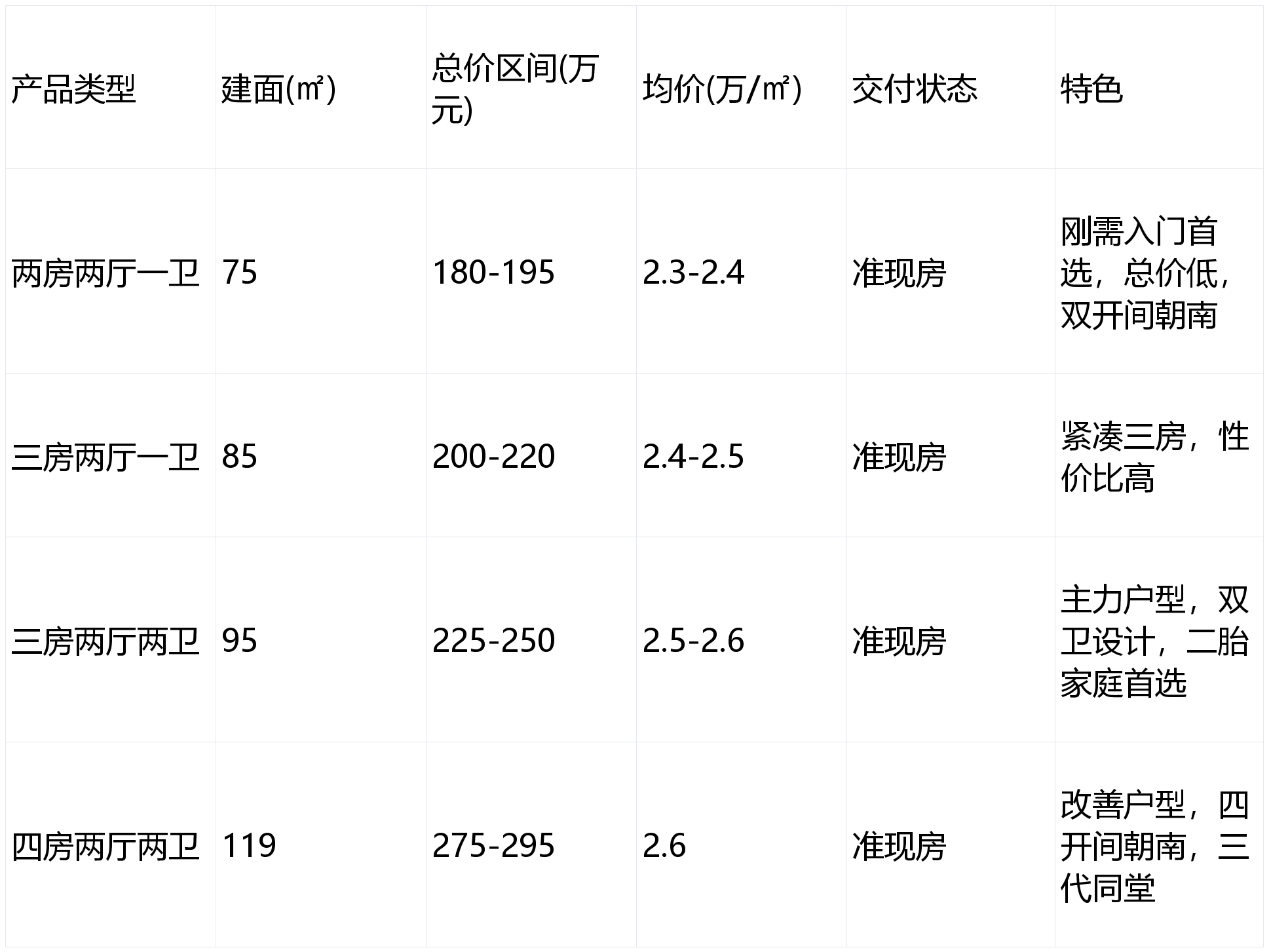 【层高】:18层高层【拆修】:拆修【梯户比】:两梯四户、三梯六户【均价】:2。6万【总价】:187-264万【绿化率】:约35%【容积率】:2。3【交房时间】:款清交房【物业费】:旺都物业3。6元【车位配比】:1!1。